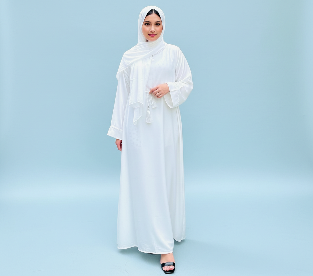 Elevate your spiritual journey with our Essential White Abaya, thoughtfully designed for Hajj, Umrah, and modest everyday wear. Crafted from lightweight, breathable fabric, this abaya offers a perfect balance of comfort, elegance, and practicality—ideal for long hours of worship and movement.